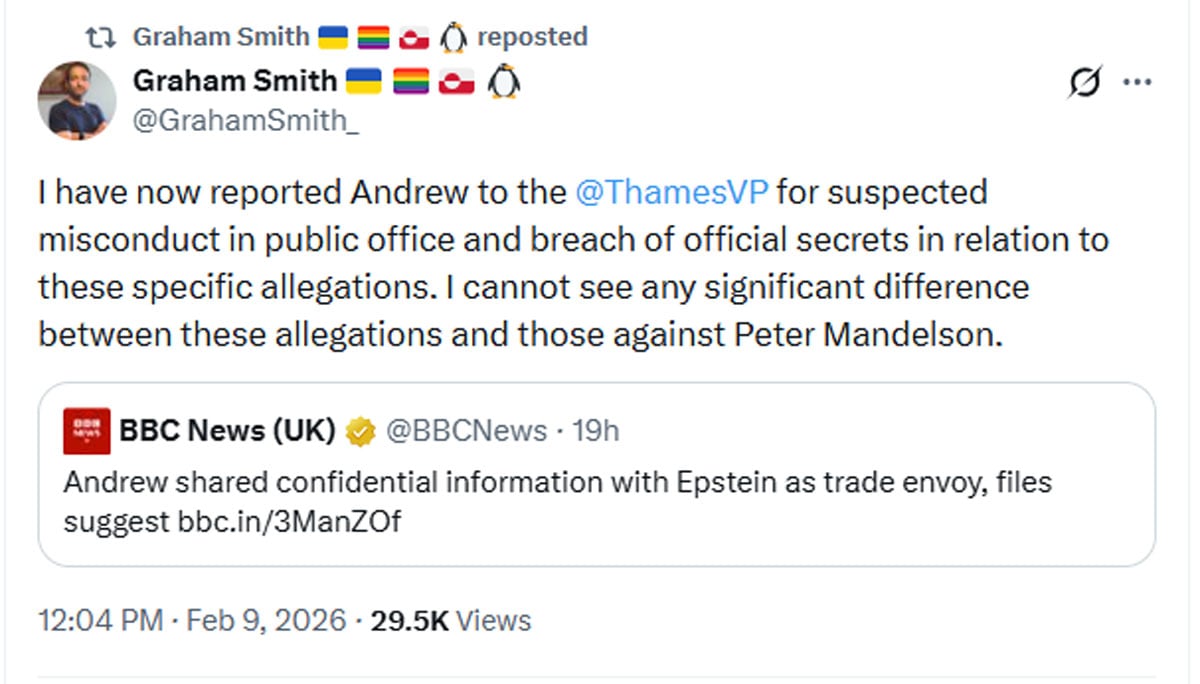Earlier, the campaign group chief Graham Smith tweeted, “I have now reported Andrew to the @ThamesVP for suspected misconduct in public office and breach of official secrets in relation to these specific allegations. I cannot see any significant difference between these allegations and those against Peter Mandelson.”