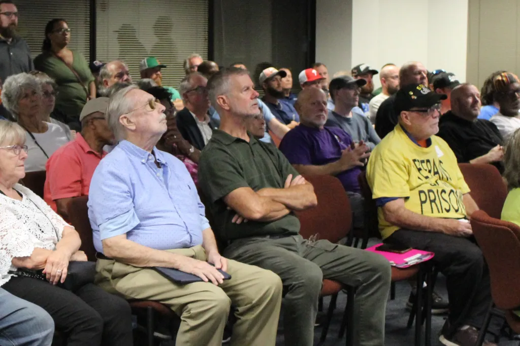 Roughly 200 people crowded into a New Castle County Planning Board meeting in October, 2025, mostly to oppose plans for a data center near Delaware City | SPOTLIGHT DELAWARE PHOTO BY OLIVIA MARBLE