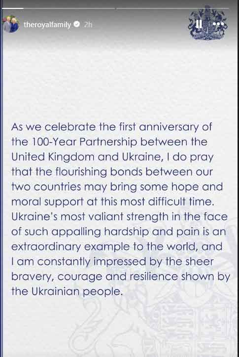 King Charles said he stands with Ukraine as he lauded bravery, courage and resilience shown by the Ukrainian people in a message celebrating the first anniversary of the 100-year partnership between the United Kingdom and Ukraine.