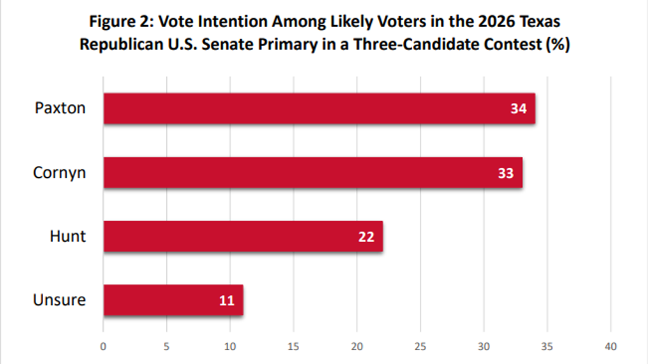 The latest polling, conducted between Sept. 19 and Oct. 1, shows Paxton with a 1% lead over Cornyn, with 34% of likely primary voters saying they would vote for the attorney general while 33% said they would vote for Cornyn. U.S. Rep. Wesley Hunt was third in the poll, garnering support from 22% of likely voters. Eleven percent of voters said they were unsure who they would vote for.