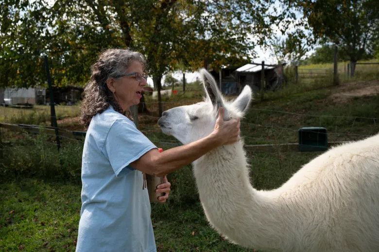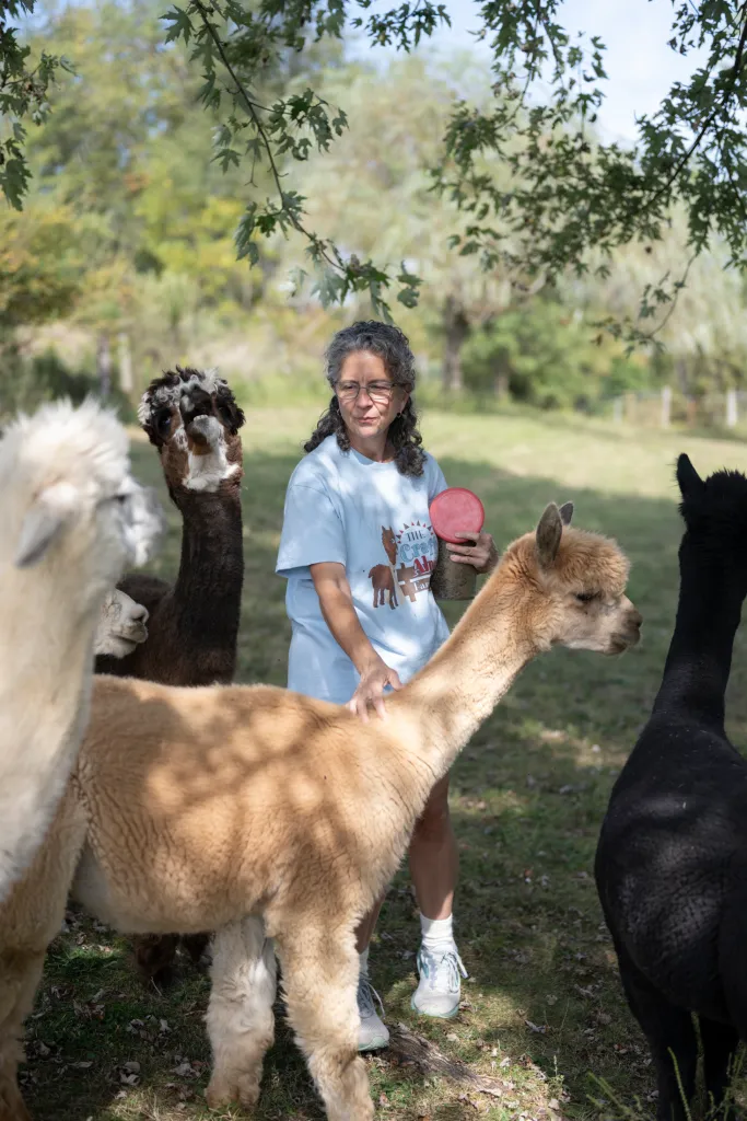 Ask Burns about her favorite alpaca, and she lights up. “Teddy Bear,” she says immediately, a 16-year-old Huacaya who lets her pet him and exudes calm. Her husband’s favorite is Hera, who once grew so sick she spent months living in their basement while he hand-fed her meds until she pulled through.