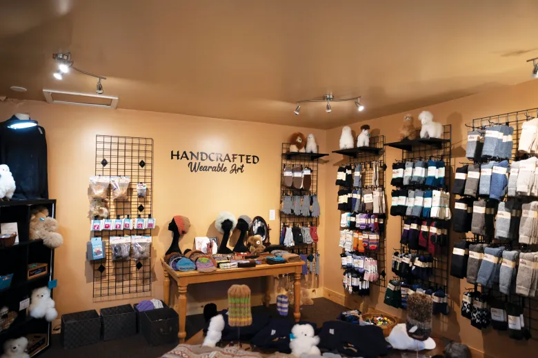 Step inside the shop and you see what she means: hats, headbands, mittens, toys, ornaments, and yarn. The yarn even comes labeled with the name of the alpaca who grew it.